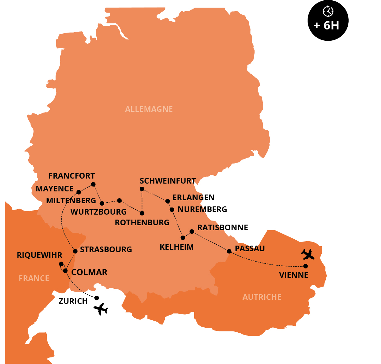 C’est à Vienne que débute votre traversée européenne. Ville de musique et de résidence des Habsbourg, la capitale autrichienne est le point de départ idéal de cette croisière fluviale qui vous mène du Danube au Rhin, avec une multitude d’escales au coeur de l’Allemagne. L’épopée se termine en beauté avec Strasbourg et Colmar, deux perles sublimes de l’Alsace.